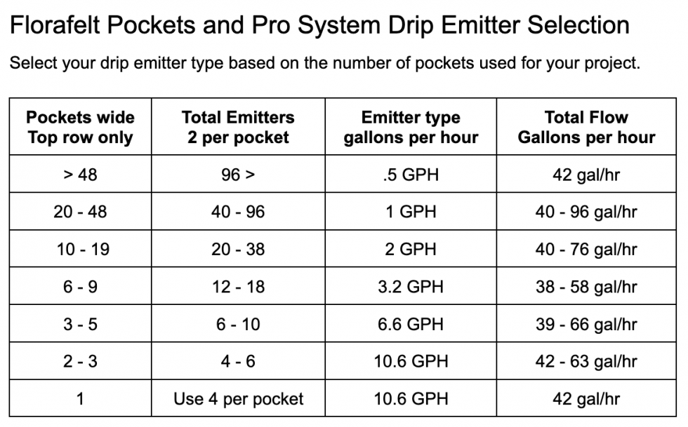 Drip irrigation tubing should be located on the top row only for Florafelt systems. Water wicks downward to all the pockets typically favoring the lower pockets.