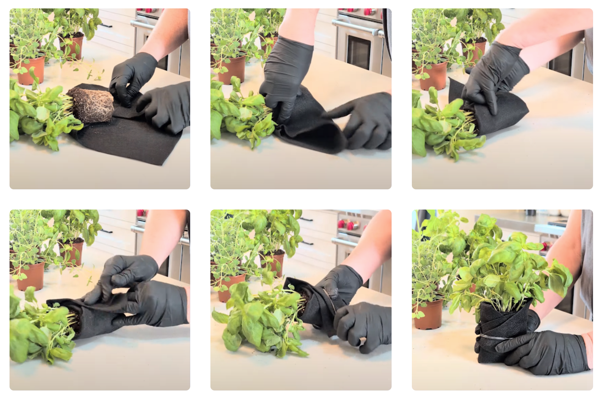 Wrap the Roots: Gently remove the plant from its pot. Place the root ball and soil onto a Florafelt Root Wrap. Fold the felt around the root ball like a small pouch or "burrito," then secure it with a rubber band.